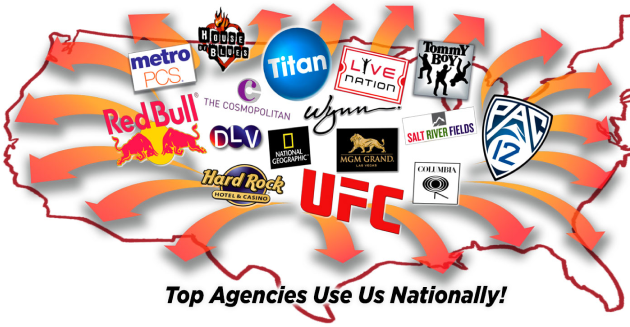 We have the pleasure of a series of continuing relationships with many major national brands such as Red Bull, UFC, Live Nations, Golden voice and MGM, many of our client relationships span decades